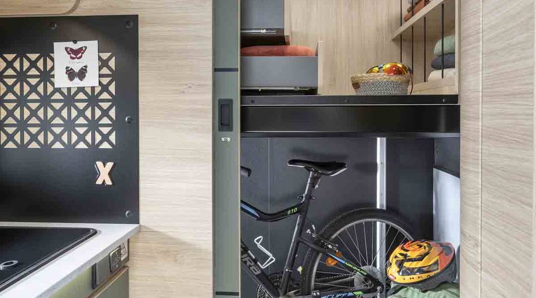 C’est le grand frère avec garage et dressing ! La partie avant est identique au X550 mais l’arrière offre un incroyable concept de modularité : Le système SDR (Smart Dressing Room) permet le réglage du dressing en hauteur pour moduler la soute-garage en fonction de vos besoins